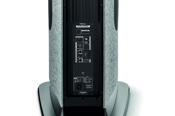 Rückansicht des «Master»-Lautsprechers mit dem Anschlussfeld für Audioquellen.Die Signalübertragung zum zweiten Lautsprecher («Slave») erfolgt kabellos über eine Ultra-Wideband-Technologie (UWB), die eine hohe Bandbreite und eine Auflösung von 96kHz/24Bit bietet. Alternativ kann der zweite Lautsprecher über ein Link-Kabel verbunden werden, wodurch die Auflösung auf 192kHz/24Bit erhöht wird.