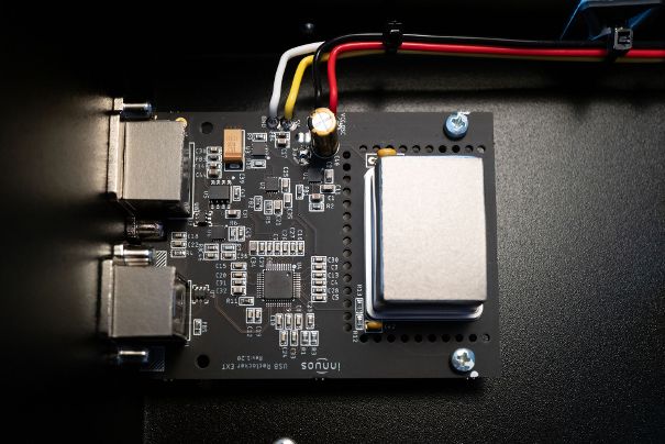 Innuos verwendet für den Phoenix USB dieselben speziellen Absorber wie bei ihrer Referenz, dem Innuos-Statement-Musikserver.Ein grosser Teil des verfügbaren Gerätevolumens dient der Spannungsversorgung der Re-Clocker-Platine, die fast ein wenig verloren wirkt. Innuos legt höchsten Wert auf eine getrennte Spannungsversorgung des USB-Chips und des OCXO-Takt-Oszillators mit zwei Präzisions-Linearnetzteilen. Die gesamte Technik kommt aus dem Statement-Musikserver. Die Platine, welche die Gleichrichtung und Glättung enthält, ist auch so beschriftet. Der völlig überdimensionierte Ringkern-Trafo kommt natürlich noch hinzu. Der schaltungstechnische Aufwand ist enorm.