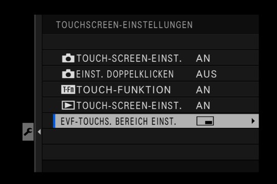 Mit dem Fokushebel lässt sich der Schärfepunkt selber bestimmen. Dies gelingt sehr zügig und genau. Dabei bleibt man mit dem Auge dauernd am Sucher und kann die Grösse des Feldes mit dem hinteren Einstellrad verändern. Ist der Touchscreen beim Blick durch den Sucher aktiv, kann auch der Daumen über den Bildschirm fahren und das Fokusfeld platzieren. Bei den ersten Versuchen wollte mir dies nicht so recht gelingen. Dauernd verschob sich das AF-Feld scheinbar selbstständig. Bis ich herausfand, dass die gesamte Displayfläche aktiv war und meine grosse Nase dauernd dazwischenfunkte. Nachdem ich die aktive Fläche auf rechts unten beschränkte, war mein Daumen wieder Herr über das Autofokusfeld.