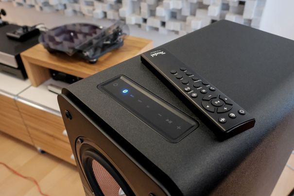 Sensor-Bedienfeld auf dem Aktivlautsprecher und eine hochwertige Fernbedienung aus Aluminium.Der Funktionsumfang ist im Grunde komplett und macht das System mit allen Erweiterungsmöglichkeiten zum perfekten Allrounder von Stereo bis AV.