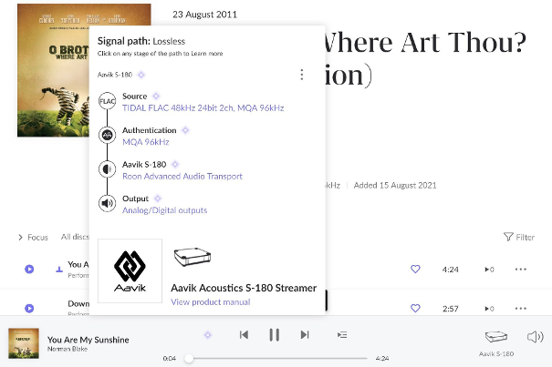 Signalweg bei der Wiedergabe eines MQA-codierten Tracks von Tidal.Das Bedienkonzept und die Aavik Stream App überzeugen. Die Beschränkung auf iPad (Apple) ist zur Kenntnis zu nehmen. Wer Roon nutzen will, wird ebenfalls glücklich, kann den Streamer dann mit allen Smartgeräten bedienen und dazu in ein Multiroomsystem integrieren.