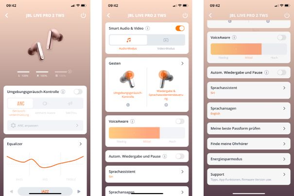 Beispiele von Untermenüs der JBL Headphones App: Z. B. Equalizer (Voreinstellungen und individuell), Festlegung von bestimmten Gesten an den Earbuds und rechts eine Einmessung zur Prüfung der optimalen Passform der JBL Live Pro 2.Darüber hinaus erlaubt die App eine komfortable Bedienung und eine individuelle Festlegung aller Usability-Einstellungen inkl. Sprachassistenten, Gesten und der Intensität der Geräuschunterdrückung der JBL Live Pro 2.