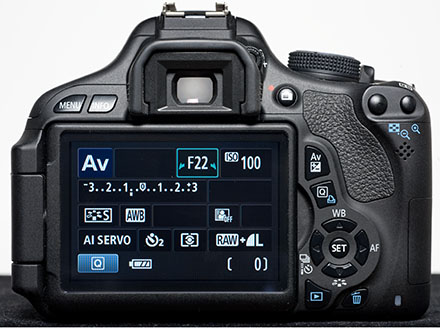 Die Aufnahmeinformation können bei der Canon 600D nicht nur auf der Rückseite angezeigt, sondern auch direkt verstellt werden. Hier ist gerade Blende ausgewählt und kann nun vom Wert 22 nach oben oder unten verstellt werden. Diese Möglichkeit bieten heute die Mehrheit der DSLRs, seit sie von Olympus eingeführt wurde.