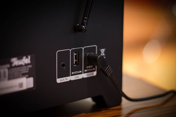 Analog-Eingang, USB-Ladebuchse und Stromzufuhr vom externen Stecker-Netzteil.Radios soll man einfach bedienen können. Dieser Vorsatz ist eine der Stärken des Radio 3sixty. Bei erstmaliger Inbetriebnahme kommt der Setup-Assistent und fragt nach dem WLAN-Code, damit Internetradio und Spotify Connect in Gang gebracht werden können. Danach hat man Ruhe mit Setup.