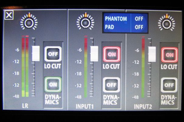 Durch antippen des Displays öffnet sich das entsprechende Fenster, in dem Veränderungen vorgenommen werden können.Zu beachten ist, dass bei Verwendung von phantomgespiesenen Mikrofonen die Batteriebetriebsdauer verkürzt wird.