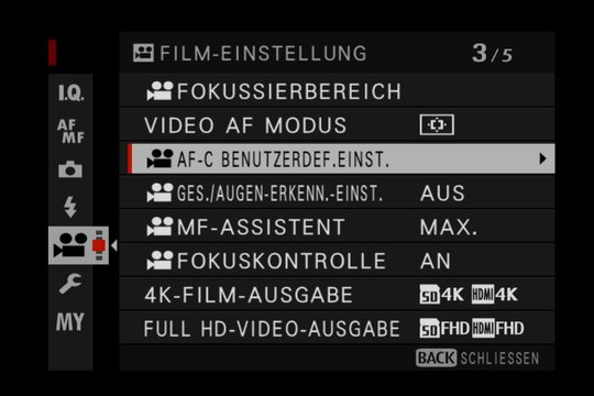 Wer das erste Mal gemäss Handbuch die Videoeinstellungen vornimmt, wird enttäuscht feststellen, dass der Autofokus gar nicht nachgeführt wird. Die Anleitung ist hier etwas irreführend. Sie empfiehlt, den Fokus-Schalter auf Einzel-AF zu schieben, vergisst jedoch zu erwähnen, die Gesichtserkennung einzuschalten. Erst dann wird bei Personenaufnahmen, bzw. Gesichtern, die Schärfe automatisch nachgeregelt.