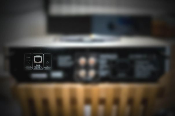 Der Netzwerkanschluss.Am einfachsten geht es, wenn man das Gerät mittels Ethernet-Kabel direkt mit dem Router oder einer Netzwerk-Dose verbindet. Das Set-up verläuft dann automatisch und geschwind. Das Gerät bekommt seine IP-Adresse und ist eingebunden.