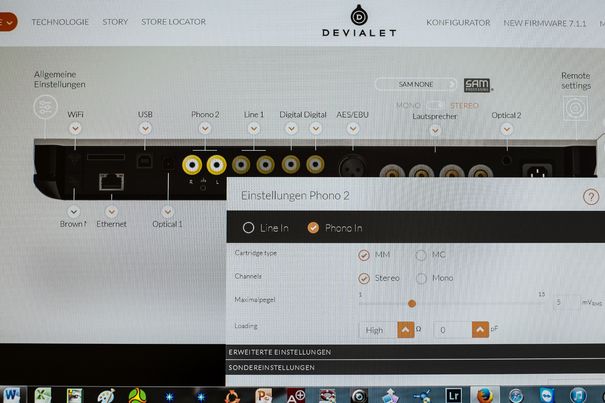 Der Konfigurator auf dem PC am Beispiel der Konfiguration des Phono-Eingangs.Ich habe den Devialet 120 mit verschiedenen Lautsprechern aus meinem Studio getestet. Vom ausgewachsenen Standlautsprecher (WLM-Diva MKII und Lyra Reference MKIII) bis zu den W5 Kleinmonitoren von Boenicke und einiges dazwischen, um unterschiedliche Wirkungsgrade und Impedanzen zu berücksichtigen. Die 120 Watt Nennleistung erwiesen sich in jedem Fall als völlig ausreichend. Ich verfüge allerdings über Lautsprecher, die ein unproblematisches Lastverhalten aufweisen. Flächenstrahler usw. kann ich nicht beurteilen.