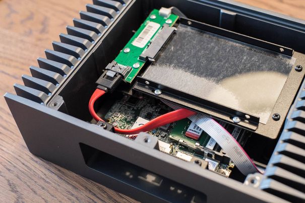 Steckplatz für SSD- oder HDD-Festplatten, zugänglich unter der Bodenplatte.Nucleus enthält einen Steckplatz für einen SSD- oder HDD-Drive, zugänglich über die abschraubbare Bodenplatte. Die Installation ist relativ einfach, aber Sache des Kunden. Roon liefert Nucleus ausschliesslich ohne interne Speicherbelegung aus.