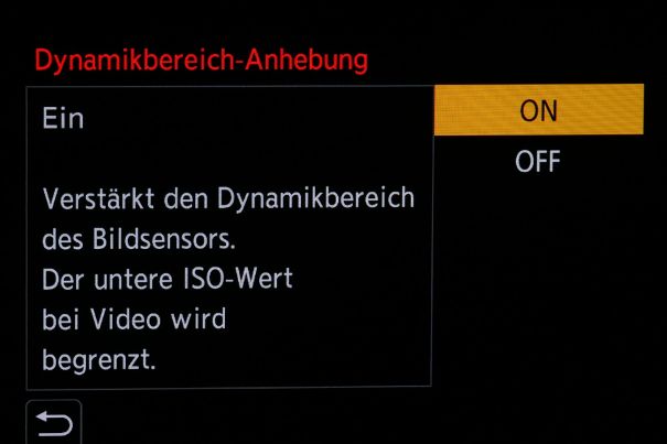 Diese Dynamikbereich-Anhebung ist jedoch nur bis zu einer Bildrate von maximal 60 Bildern pro Sekunde möglich. Zudem wird dabei im Standard-Bildstil die Untergrenze der ISO-Empfindlichkeit auf 800 limitiert, zusammen mit Bildstil HLG und V-Log sogar auf 2000.