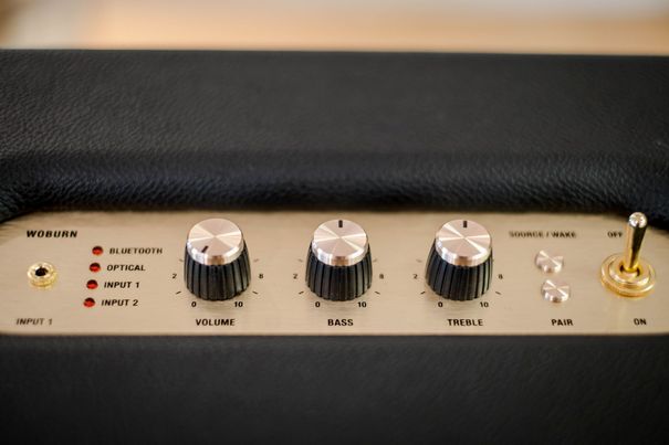 Der Woburn hat schon fast die Grösse eines regelrechten Gitarren-Amps.Vergleicht man den Marshall Woburn mit dem Kilburn, so hat man einfach eine viel grössere Ausführung vor sich. Dazu verfügt der Woburn noch über einen weiteren Analogeingang (Cinch-Stecker) und einen optischen Digitaleingang auf dessen Rückseite. Betreiben kann man ihn nur mit Stromkabel. Portabel ist er schon, aber wohl eher im häuslichen Umfeld. Vom Wohnzimmer in den Hobbyraum oder auf die Terrasse.
