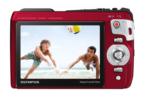 Bis zur Vorstellung der TG-1 war die TG-820 das Topmodell im aktuellen Tough-Sortiment von Olympus. Die Kamera wirkt im Vergleich zur TG-1 recht flach, ist aber nur ein klein wenig dünner und weniger breit als die TG-1 jedoch etwas höher. Die TG-820 verzichtet auf das Modusrad der TG-1 (vergleiche Rückansichten beider Modelle).