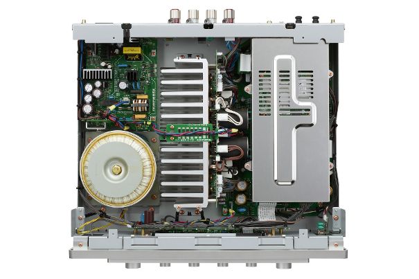 Im rechten Bereich sitzt die vollständig abgeschirmte Digital-Einheit mit Netzwerk-, HDMI- und digitalen Anschlussmöglichkeiten. Diese ist ihrerseits unterteilt: Unterhalb einer weiteren Abschirmschiene sitzt eine aufwändig bestückte, zweigeteilte Platine mit dem DAC- und dem Phono-Board. Letzteres ist nominell für Phono-MM ausgelegt. Wer Marantz-Verstärker jedoch kennt, weiss um die Qualität und Rauscharmut der Phono-Eingänge.