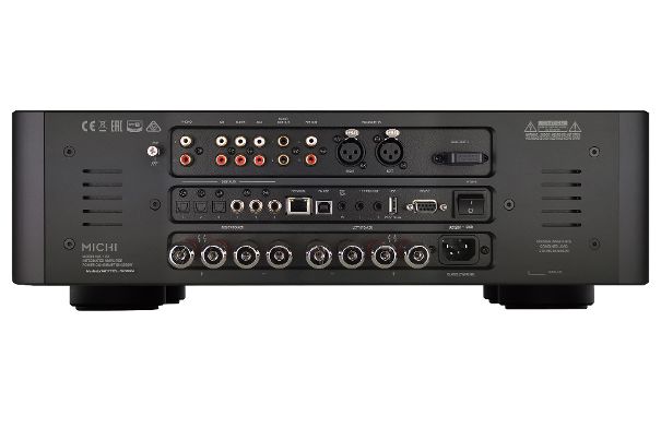 Setup und Bedienung sind auch beim Michi-Vollverstärker vorbildlich einfach. In der Hochglanzfront ist nämlich ein Multifunktions-Display eingebaut, welches die Installation und den alltäglichen Umgang mit dem Gerät enorm erleichtert. Hier kann man Eingänge umbenennen, die Grundlautstärke definieren oder auf Wunsch Bässe und Höhen wie auch die Balance regulieren. Dies alles geschieht bequem über die ausnehmend übersichtliche und gut in der Hand liegende Vollmetall-Fernbedienung.