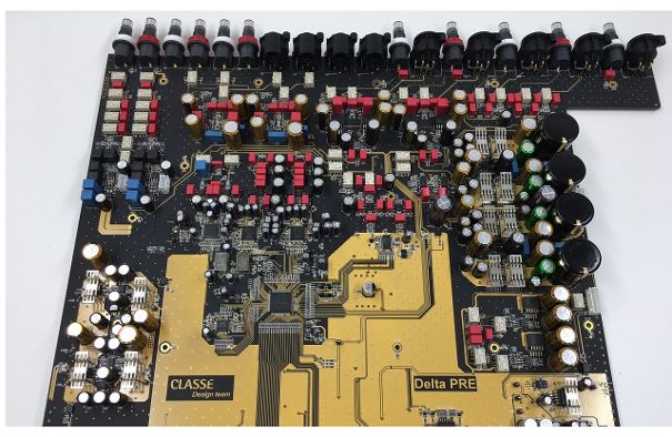 Die Anschlussperipherie des Delta Pre zeigt, dass er für sämtliche analogen und digitalen Quellen bestens gerüstet ist.Auch die Hochpegel-Abteilung des Delta-Pre wurde auf Höchstleistung getrimmt: Der lineare Frequenzumfang reicht (im Bypass-Modus) bis zu sagenhaften 2 MHz. Rauschen liegt 130 dB unter dem Nutzsignal. Möglich wurde dies durch die Realisierung von extrem kurzen Signalwegen und die ausgeklügelte Machart der Hauptplatine, die in sechs Lagen aufgebaut ist. Die oberste und unterste Schicht beherbergen je die Signalspur, Schicht zwei und fünf die benachbarte Masseführung, und die inneren beiden Lagen die Stromversorgung. Ein neu entwickeltes, mehrfach stabilisiertes Linearnetzteil versorgt die analogen Schaltkreise – völlig unabhängig von der Digitalsektion.